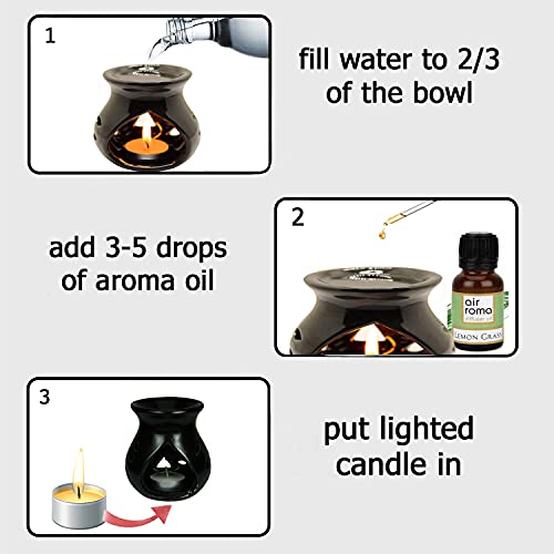 AirRoma Ceramic Aroma Black Diffuser Burner with 10ml Lemon Grass Oil & 2 Pcs Candles