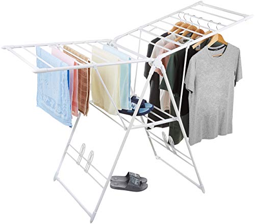 Wings with sturdy horizontal rods for hanging clothes; handy shelf for air-drying sweaters; space for drying 2 pairs of shoes