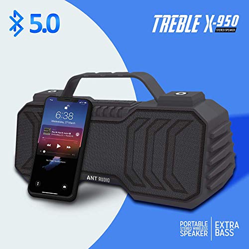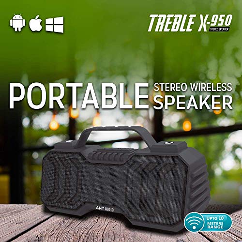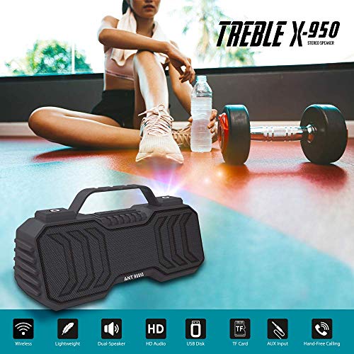 Latest Bluebooth 5.0: Once connected to your device, the Treble X 950 has an extended wireless range (up to 10 mts) and enhanced connectivity and with MIC, support for calling features.;Shocking Sounds: Our speakers TWS technology allows you to pair two portable Bluetooth speakers with your phone for true dual enhanced stereo sound, giving you a small cinema feel.;Compact & Practical : Small size and light weight, can be hung on the bag or duffel bag. High efficiency 1200mAh lithium-ion battery can be used to power the power all day.;Five Play Mode: Practical carabiner, TF (supports WAV / FLAC / APE / MP3 format) and Bluetooth interface, and 3.5 AUX input port and USB and FM with more choice modes.;;;;;;