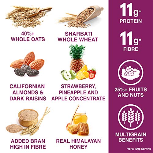 Ingredients : Rolled Oats (41.2%), Whole Wheat Flakes 29% (Wheat, Sugar, Iodized Salt, Malt Extract and Antioxidants – INS 322 & INS 306), Apple Juice Concentrate (10.3%),Broken Rolled Wheat, Raisins (3.1%), Almonds (2.1%), Invert Syrup, Wheat Bran, Oat Bran, Honey (1%) & Antioxidants (INS 306)