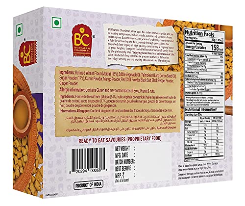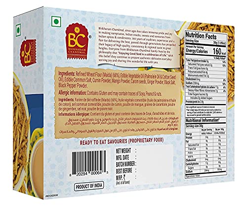 This is a quality product from Bhikaram Chandmal which is 100% vegetarian and is manufactured under hygienic conditions. This product is made with finest quality of ingredients and originated from the bikaner,state of Rajasthan in India. This is a quality product from Bhikaram Chandmal which is 100% vegetarian and is manufactured under hygienic conditions. This product is made with finest quality of ingredients and originated from the bikaner, state of Rajasthan in India. Our assortment of namkeen is recognized and appreciated for its crispy nature and fresh taste. They are prepared in pure quality oil but in minimum quality keeping the fat content under control. They are primarily salty products, crispy and crunchy.