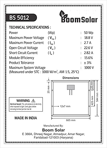 Specification: BOOM SOLAR Panel 50 watt – 12 Volt Mono PERC BIS Certified (Pack of 2)