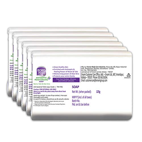 BoroPlus Antiseptic + Moisturising Soap Neem, Tulsi & Aloe Vera Kills 99.99% Germs and Kills Virus Softens and Moisturises Skin From India’s No. 1 Antiseptic# Brand Recommended by Doctors Gives Healthy Skin Enriched with Antiseptic & Healing Power of Neem & Tulsi Moisturising power of Aloe Vera Protects your entire family Free from Paraben, Silicones and Artificial colorants Toilet soap: Grade 1. TFM 76% Directions: First, wet your hands and then rub the BoroPlus Antiseptic + Moisturising Soap gently between them until the soap lathers up. Massage the lather over your face & body before rinsing with water.