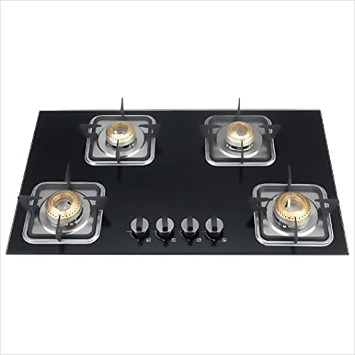 4 Burner Tempered Galss, Patented Easy Cleaning Burner System, High Efficiency Indian Brass Burner, Square Base Cast Iron Pan Support, Bakelite Knobs, One Touch Advanced Auto Ignition, Spill Proof Tray