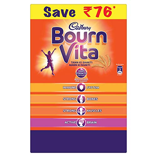 Cadbury Bournvita is a nutrition brand with a 70 year legacy in India. Cadbury Bournvita is a health food drink with inner strength formula which has nutrients that support – Immune system(8 immunity nutrients), Strong bones (Vitamin D, Phosphorous), Strong muscles (Protein, Vitamin D) and Active Brain(Iron, Iodine, Vitamin B2, Vitamin B12). Recommended 2 serves per day as part of a balanced diet and a healthy lifestyle.