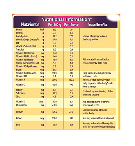 It contains Protein (which helps in maintenance and growth of muscle mass), Vitamin B12/B2 (which is essential for maintaining a normal function of the nervous system) and Iodine/Iron (which support normal cognitive functions.