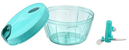 It’s time to get your chopping jobs done the smart & simple way with this manual chopper!, This hand food chopper takes the hard work out of chopping & blending vegetables, fruits, nuts and herbs. Features sharp stainless steel blades for fast and even chopping/mincing, comfort soft grip lid, anti-skid base, easy pull cord, and a large handle Great for small kitchens, RVs, travel and camping. Made from BPA free, food safe plastic. Blades are all concealed during use for the utmost safety
