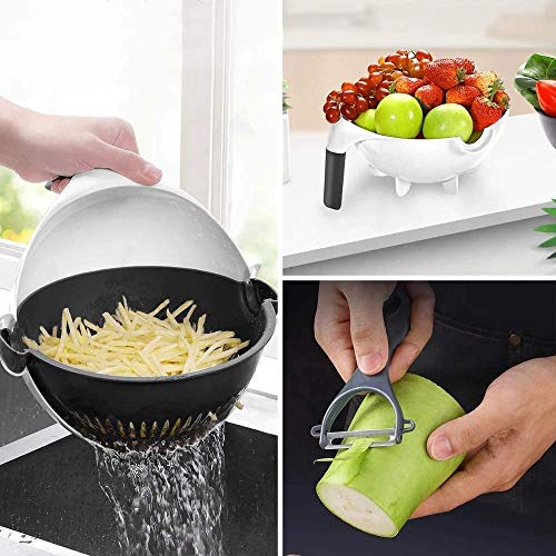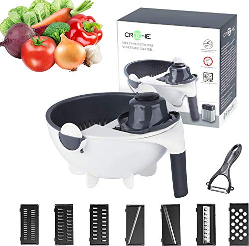 12 in 1 Multi-Function Vegetable Slicer with Drain Basket, Multi-functional Kitchen Veggie Fruit Shredder Slicer Grater. With 8 replaceable blades you can cut cheese, tomatoes, onions, cabbage & cucumber in different sizes, shapes, and thicknesses. 2 Litres large capacity, sliced, shredded, cut flowers, milled and other functions, use what you want, the replaceable blades you can in different shapes, sizes and thicknesses. The all-new 2021 vegetable slicer comes with a special drainage feature that allows you to clean vegetables directly through the drainage system after you’ve cut them. Skip the tedious process of cleaning and make it easier. The drain basket and food container are designed with a rotating snap to instantly wash and slice quickly. It has a rotating buckle, automatic angled rotation, the drainage basket is always stable, easy to clean and drain. Easy to store & clean: You can hang it up by its handle on pot racks to display and save shelf space. Top cover of the chopping dish can be removed with ease, Comfortable non slip handle can be controlled with free one hand.