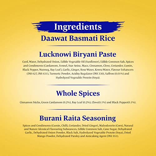 COMPLETE SOLUTION : Contains Daawat Basmati Rice, Lucknowi Biryani Paste, Whole Spices and Burani Raita Seasoning