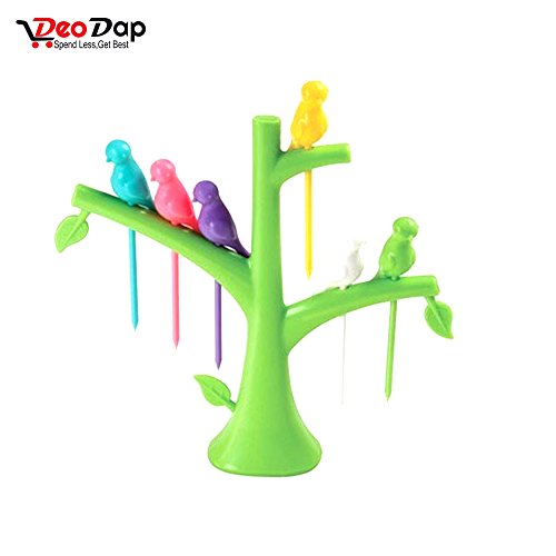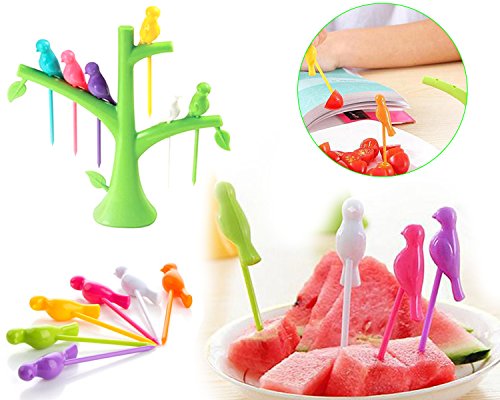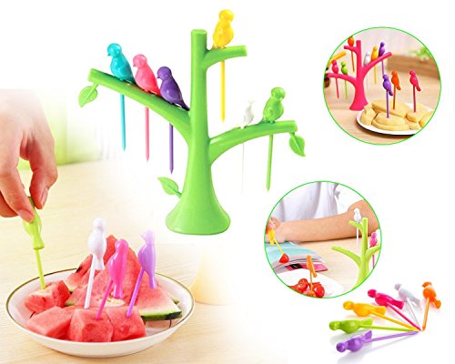 Birdie fruit fork set is a brightly coloured stand shaped like a tree with branches, which has six slots for the forks to be placed in. These forks are highly useful in eating cut fruits and fruit salads