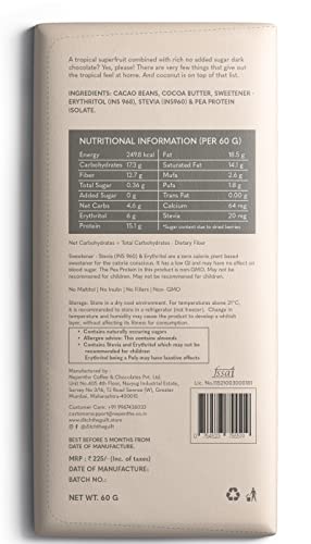 Net Weight – 60 Grams Shelf Life – 3 months Ingredients: Cacao beans, Cocoa butter, Pea protein isolate, Coconut, Erythritol (INS 968), Stevia (INS 960) Description – A tropical super fruit combined with rich no added sugar dark chocolate? Yes, please! The most versatile ingredient that is also Keto friendly, this coconut chocolate bar is lush and absolutely nourishing. Made with organic Cacao Beans and natural Cocoa butter; Sweetened with Stevia Enriched with Pea Protein Isolate Our Cacao – The Cacao is Air roasted on a fluid bed proprietary roaster to get the perfect balance of taste and health by not over roasting the cacao and keeping all the nutrients in the cacao intact. It is stone ground for 3 days. Our mission is to make super delicious sugar free chocolates with the cacao beans from our farm, so that you can eat sugar free and live guilt free. Storage Instructions Re-pack the chocolates after consuming it. Store in a cool & dry environment or the refrigerator. ✓ Vegan & Keto Certified ✓ Direct Farm to bar chocolate ✓ Pure Real Chocolate ✓ No added Sugar ✓ Soy Free & Gluten Free ✓ High Protein ✓ Low Carb P.s all our chocolates are vegan, keto-friendly and very rich in micro nutrients like zinc, magnesium, manganese iron and calcium (from the cacao beans and inclusions e.g. Nuts, berries)