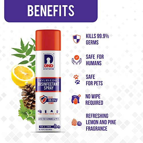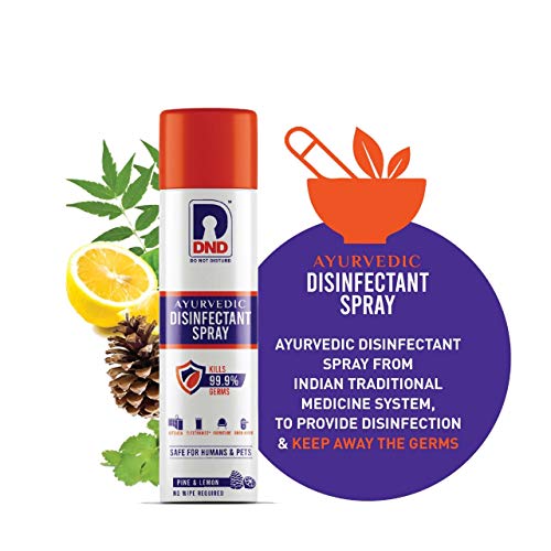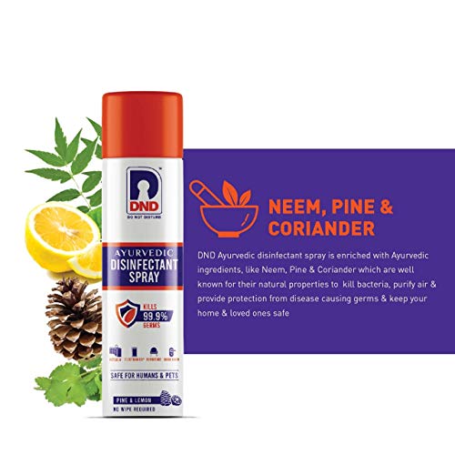 DND Ayurvedic disinfectant Spray kills 99.9% germs Disinfect hard & Soft surfaces like Door Knobs, Keys, Toilet seat, Electronics, Furniture, Kitchen, Pet areas, Automobiles Enriched with Ayurvedic ingridients like Neem, Pine, Coriander which are known for their natural properties to kills germs. Directions for use: Shake can well and spray on surface to disinfect. Allow to air dry. No need to wipe