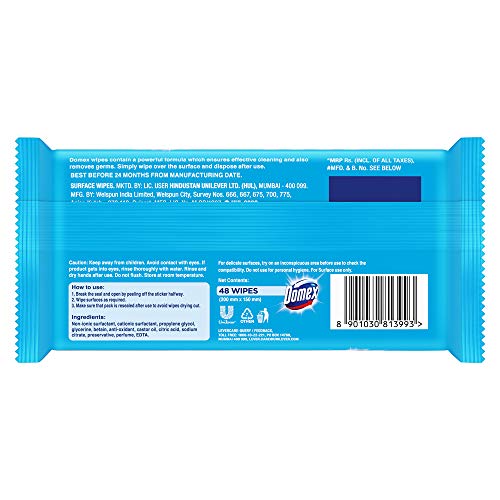 Domex multi-purpose germ removal wipes is a convenient and simple way to hygienically clean and remove germs from surfaces. It contains a powerful formula which ensures effective cleaning and germ removal; from surfaces and leaving behind a pleasant fragrance. Each pre-moistened disposable wipe removes germs; whenever and wherever you use it. Domex multi-purpose germ removal wipes can be used to clean all kind of surfaces in your house and can also help in removing germs from your personal belongings such as mobile phone; keys; bags; workplace; laptop and so on. This multi-purpose wipe is suitable for daily use to keep your home protected and is an easiest cum hassle-free way to keep yourself away from germs. For delicate surfaces; try out at discrete portion to check the compatibility usage: break the seal and open by peeling off the sticker halfway. Wipe the surface as required and reseal the pack after use to avoid wipes from drying out. For delicate surfaces; try out at discrete portion to check the compatibility. Domex multi-purpose germ removal wipes is brought to you by domex masterbrand family which has been providing effective sanitation to people across the globe for nearly 100 years. Over the years; in over 35 countries globally; domex has provided families with protection from harmful germs. Domex is committed to raising hygiene standards by improving general health and safety standards in communities around the world.