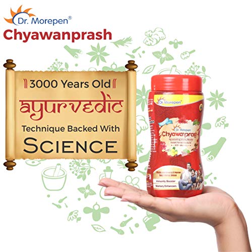 Dr. Morepen brings to you Chyawanprash that contains goodness of 22 Ayurvedic Herbs like Amla with Ashtvarg, Ashwagandha, Shatavari, Draksha, Elaychi, Vanshlochan, Jaiphala, Javitiri, Tejpatra, Lavanga, Gulab Phool, Dhaanyak, Jeerak, Dalchini, Mukta Shukti bhasma, Abhrak bhasma, Lauha bhasma, Rajat bhasma, Makardhwaj, Cow ghee, Shudh Madhu and Kesar.
