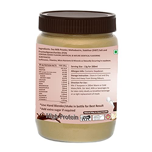 Make delicious soy milk instantly by adding 13 gm or 3 teaspoon in 200ml of warm or cold water/milk, mix well to ensure no lumps remains and delicious natural soy milk is ready for consumption. Soy milk can also blend with banana to make smoothie for improved taste.
