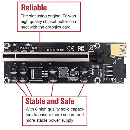 PCI-E 1X to 16X Riser Card–The graphics card power supply uses 8 solid capacitors to make the graphics card power supply more stable and safe.