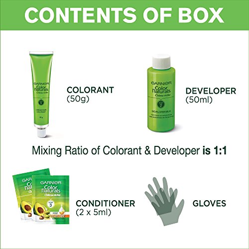 Garnier Color Naturals is crème hair colour which gives 100% Grey Coverage and beautiful rich color. It is an ammonia free hair color and has a superior Colour Lock technology which gives you rich long lasting color that lasts upto 8 weeks. Color Naturals comes in a range of 8 gorgeous shades especially suited for Indian skin tones. It is available in an easy to use kit which can be used at your convenience in the comfort of your house! It is enriched with the goodness of 3 oils – Almond, Olive and Avocado which nourishes hair and provides shiny, long lasting colour. Your Hair will love the nourishment and you will love the colour! To use, mix equal parts of the colorant and the developer in a plastic or a glass bowl and apply the mixture to your hair with a brush on dry, unwashed hair. Leave on for 30 minutes and rinse with water. Apply post colour-care conditioner (provided in kit) to the hair and rinse to reveal shiny, rich hair color. Post Colour Care: We recommend using a colour protect shampoo and conditioner for long lasting colour. Note: Always do a skin allergy test 24 hours before use.