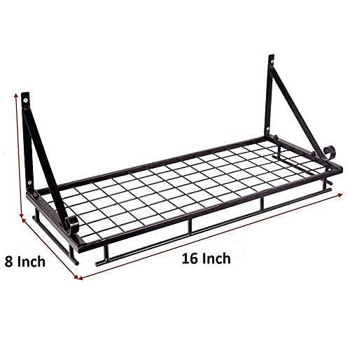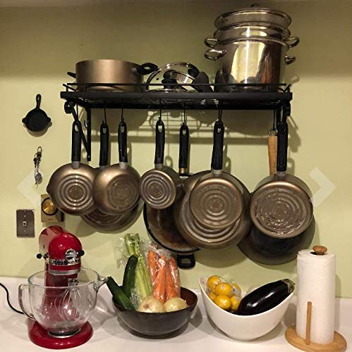 EASY TO ASSEMBLE — Minimal assembly required with quick set-up — Support brackets can be installed to support the rack from above or below — Made of steel with powder-coated finish — Beautiful decorative curved frame for stylish look — Complements most light fixtures, appliances, cookware, and design interiors — Package includes grid rack with 2 support brackets, 8 hanging hooks, and mounting hardware — Measures approximately 16″ L X 8″ W X 8″ H MULTI-PURPOSE SHELF — Ideal for any room in the house — Install in kitchen, pantry, dining area for everyday cookware or bathroom to store drying towels and toiletries — Also suitable for study, office, or walk-in closet — Sturdy center grid does double duty and functions as shelf for books, baskets, toiletries, plants, and many other household items