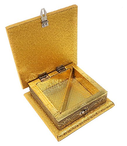 This golden dry fruit box is made up of wood and golden rexine with Rajasthani art work that makes it look traditional. A perfect designer gift with traditional rajasthani work. Its antique design makes it a multiple use item. It can be used as mukhavas box, chocolate serving box, mouth freshner box, sweets serving box. A perfect item to impress our special guests. One of the best gifting option for any occasion like festival, wedding, anniversary, birthday etc. The item will add beauty to your dinning table, centre table, guest room. There are two partitions. the partition can be removed also. Approx capacity of box is 400 Grams dryfruits.