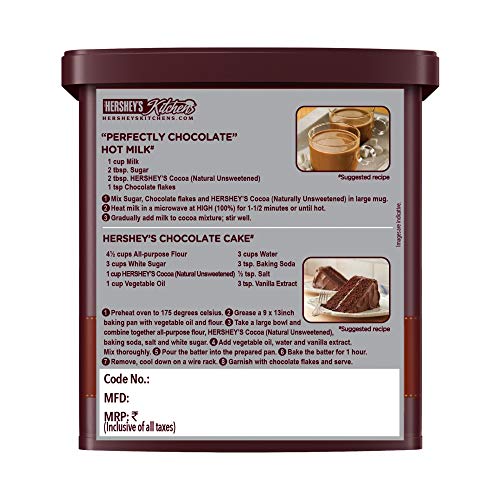Hershey’s Cocoa is 100 percent Natural and Unsweetened. It contains antioxidants also found in tea and certain fruits. Enjoy delicious desserts and baking treats with Hershey’s Cocoa. Try some unique recipes from HersheysKitchens.