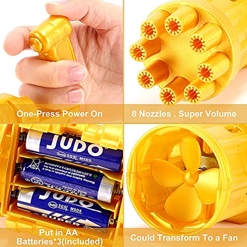 Product Features Mini Gatling Model 8 Holes Bubble Design 3 AA Batteries Required (not included in package) Easy to Use & No Leak Ideal Gift for 3+ Year Old Kids 8-Holes Design Adopting Gatling’s appearance structure, 8 bubble holes, hundreds of colorful bubbles can be blown out every minute, Looks cooler and more interesting. Cool Fan Mode The bubble machine can be used as a small fan, it will bring cool and comfortable wind. Take down the bubble machine gun head and turn it into a small fan. Easy To Use The bubble gun is made of quality ABS material, and has a handle design that fits the child’s palm. Children can carry a bubble gun with them and enjoy the fun of bubbles.