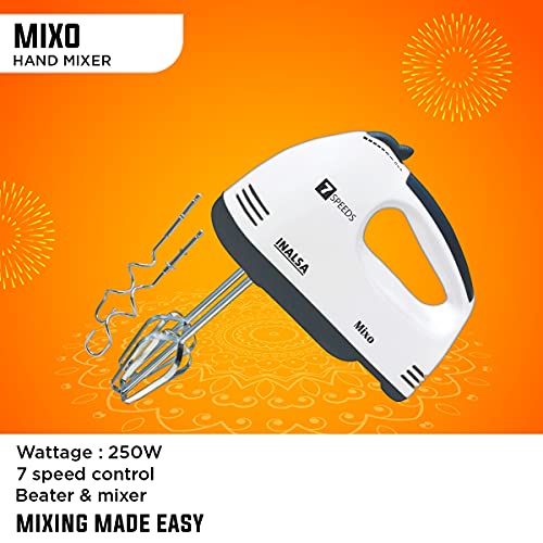 Hand Mixer Mixo-Powerful 250Watt | Variable 7 Speed Control | 2 Detachable Beaters & Whisker/Dough Hooks SS Attachments