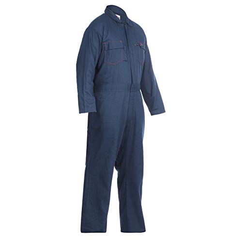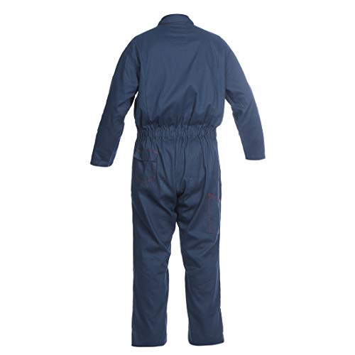 Karam blue coverall 100% cotton protective clothing. It come with 2 chest pockets with flap and Velcro closure, 2 side opening pockets for ease of access, hip pockets on left with flap and Velcro enclosure, 1 tool pocket, pen holder on right chest pocket and spectacle holder on left chest pocket. It can be used wherein mechanical actions are performed whose effects are superficial such as abrasion, cleaning materials of weak action such as mild detergents are used or where hot material not exceeding 500 C is used. It is made of mde of 200 gsm fabric with elasticized waist for better fit. High quality threads of contrast color used for stitching with plain straight cuff.