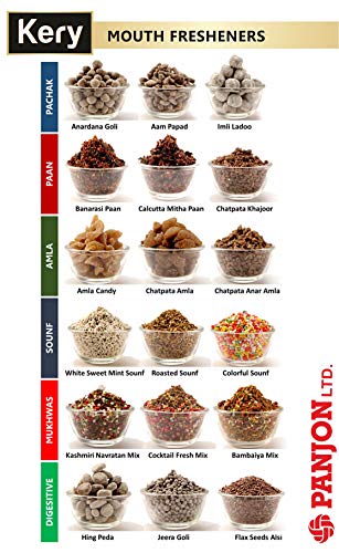 Panjon, pioneer in health products since 1977 present their premium range of Kery Mouth fresheners & Kery Candies. Kery Pachak Mukhwas are Infused with the goodness of handpicked fruits and best quality ingredients to stimulate the digestive enzymes and acts as an appetizer. It helps in digestion & improves stomach health. Try all 18 flavours of Kery Mouth fresheners & 10 Flavours of Kery Fruity Candies!!!! Kery Anardana Goli, Aam Papad, Jeera goli, White sweet saunf, Colorful saunf, Flax seeds, Banarasi paan, Calcutta paan, Sounf fresh mix, Kashmiri Navratan Mix, Anar Amla, Chatpata Khajoor, Imli Ladoo, Bambaiya mukhwas, Hing peda, Amla Candy, Chatpata amla and more. Try all our 20 flavours to tickle your taste buds. To maintain freshness, shake the bottle upside down and keep it in a cool and dry place. This Product is 100% Vegetarian.
