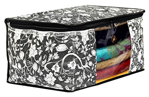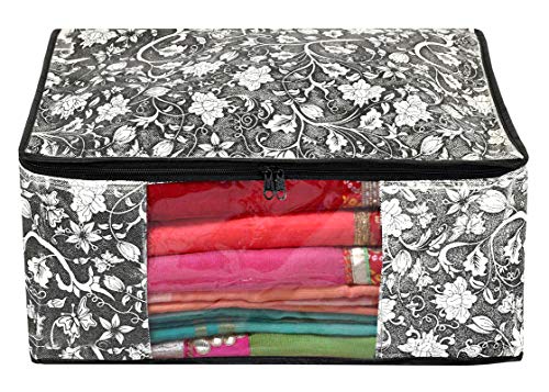 Kuber Industries Non Woven Metalic Flower Print Saree/Clothes Cover with Window Kuber Industries non woven Metalic Flower Print saree cover to organize and store your heavy and costly sarees dust, dirt and water safe. This beautiful Metalic Flower Print makes your wardrobe looks beautiful and organized too. Transparent front window gives you the convenience of better visibility. 2 premium quality zippers for easy opening and closing. Made of VIRGIN 90 GSM non woven fabric makes it durable and water repellent too. Best option to use while travelling.Large Front Window to instantly know what is kept inside without opening the bag again and again.Cotton breathable fabric to keep your stuff inside protected from dust dirt and bad spell. Quilted from all the sides to give cushion to whatever is stored inside.Description