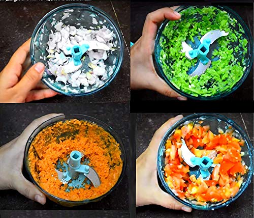 The chopper has 3 sharp stainless steel blades that cut through vegetables easily. The number of pulls determine the size of the cuts