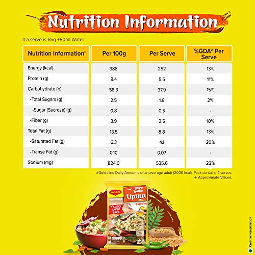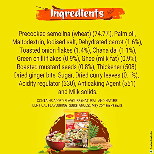 Upma has been a part of our food culture for ages, delicious yet light it is also the perfect snack to satiate your sudden hunger pangs. Preparing mouth-watering upma at home now gets easier, quick and fun with MAGGI Ghee Tadka Upma Express. Soft flavourful upma filled with goodness of vegetables, suji and ghee for a wholesome treat. It is tempered with curry leaves, mustard seeds and garnished with crispy chana dal; all you need to do is add 360ml of hot water and enjoy a delicious upma in just 4 minutes. A pack of Ghee Tadka Upma can serve 4 at a time and is a convenient way to spend some fun time with family. You can also give it your own little twist and prepare Tomato Upma or Shahi Upma in just a few minutes. Method of Preparation: Empty the Maggi Ghee Tadka Upma into a bowl and add hot water (approx. 360ml ((2 ½ Tea Cups)). Mix well and cover it with lid, keep the lid closed for 4 minutes. Open & enjoy! Allergens: It may contain Peanuts. Storage: Store in a cool, dry and hygienic place.