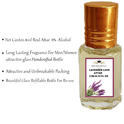 Menjewell fragrances lavender love attar, 3 ml. When used on the skin, They absorb and become part of the body chemistry. It is soothing, and anti-inflammatory for the skin settles the emotions and clears the mind.