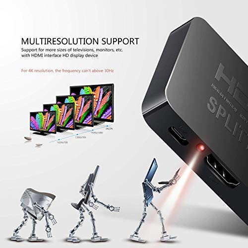 4K@60Hz HDMI 2.0b Splitter: 1×2 HDMI splitter support Ultra HD 4Kx2K @60Hz RGB 4:4:4, HDCP 2.2, HDMI2.0b, HDR, 1080P@120Hz, Support deep color 30bit,36bit, Max Bandwidth of 18.5Gbps, backward compatible with 1080i/720P/576P/576i/480P.