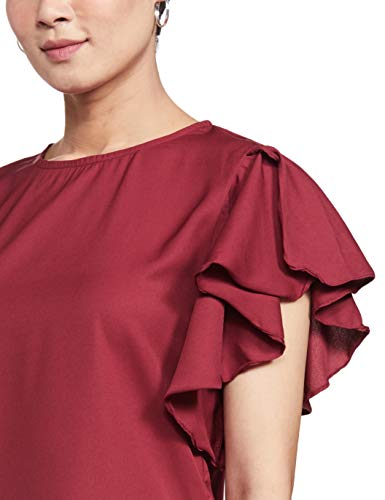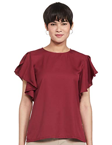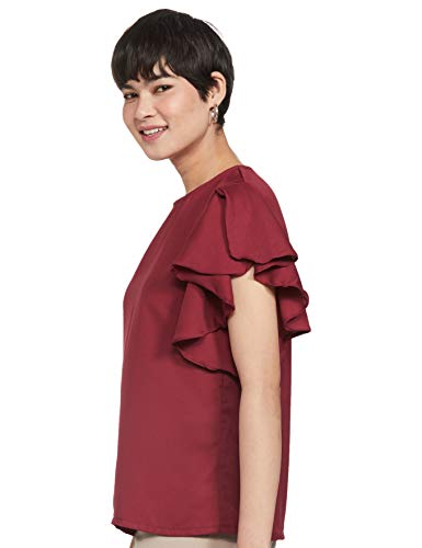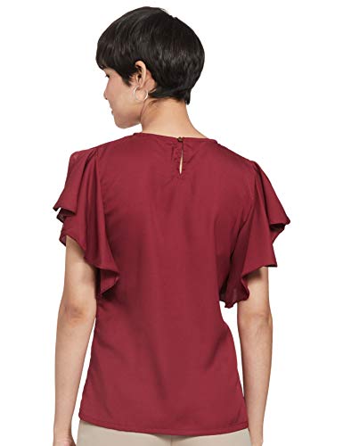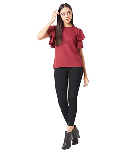 Maroon solid ruffled top, Has a round neck and short sleeves, Has a button closure