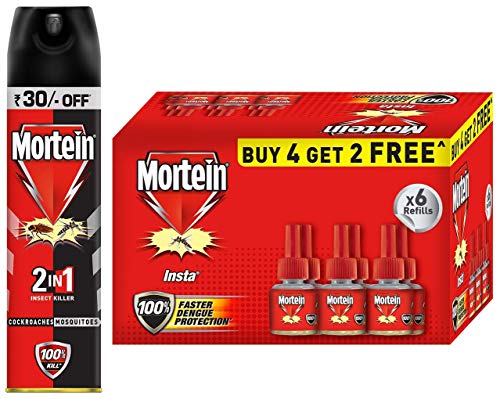 Mortein 2-in-1 insect killer spray kills mosquitoes, cockroaches and flies with 100 percent kill guarantee “*100 percent mortality rate after 24 hours of product exposure under test conditions” it is equipped with a unique dual purpose nozzle which facilitates- a) direct spray on mosquitoes and flies b) easy reach spray for hidden cockroaches its pleasant lemon fragrance keeps the room fresh.