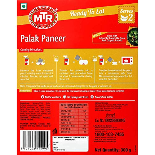 Specification: MTR Ready to Eat, Palak Paneer, 300g Pack