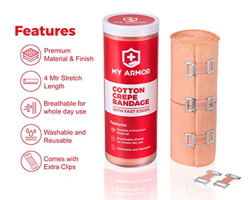 Specification: MY ARMOR Cotton Crepe Bandage for Pain Relief, 15cm X 4mt Tape for Injury & Muscle Compression with 2 Extra Clips, Pack…