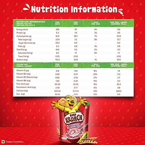 Relish the goodness of Nestlé Koko Krunch which provides more than just a good start to your day, by offering a sensible, great-tasting breakfast focused towards a better, healthier future. Whole grain is an important part of a healthy balanced diet and Nestlé ensures you and your kid gets the whole grain goodness paired with a lot of deliciousness.What’s more. Koko Krunch is your everyday reliable source of Vitamin D and Calcium as well as B-vitamins, Iron and Fibre. These nutrients in form of crunchy outside layer with a yummy inside, combine to give a nourishing start to your day. Koko Krunch Cereals can be prepared easily by adding 30 grams of Nestlé Koko Krunch with 120 ml of warm or cold milk for an instant breakfast. The cereal remains crunchy even in warm milk. Allergens: It may contain Milk, Peanuts, Tree Nuts, Mustard, Celery, Sesame and Lupin. Storage Instruction: Store in a cool, dry and hygienic place. After opening, transfer contents to an airtight container. Use within 3 weeks.
