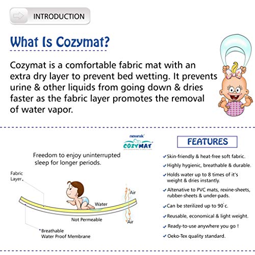 Cozymat is a comfortable fabric mat with an extra dry layer to prevent bed wetting. Also, baby’s skin breathes better, enjoys cottony softness, and is kept moisturized against friction. Give your baby the freedom to enjoy uninterrupted sleep for longer periods. Cozymat prevents urine and other liquids from going down and dries faster as the fabric layer promotes the removal of water vapor. It allows moisture to pass through, thereby giving comfort to the skin. It is an alternative to PVC mats, rexine-sheets, rubber-sheets and under-pads, which might be uncomfortable, un-breathable and may cause perspiration. Cozymat is soft, absorbent and water-proof, thus, making the mat usable for babies and adult also.