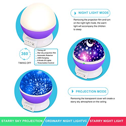 Newest Generation: 1.5 Meter USB Cord. There are 4 pcs LED Beads of warm light, blue light, green light, red light. They are match with 3 Push-Button (A B C). The night light star projector has eight modes of operation that include blue, red, green and flashing mode. It displays an amazing display of moon and stars on the ceiling of the bedroom, and has an optional setting for rotation or no rotation as well.