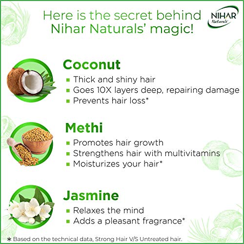 Nihar Naturals comes with the goodness of coconut and methi to give you thick and beautiful hair (based on technical study, compared to untreated hair)