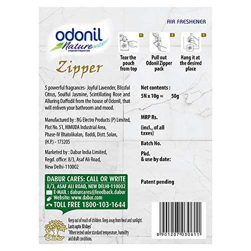Specification: Odonil Zipper – 50gm (10gm x5) | Air Freshener – Bathroom and Toilet | Lasts up to 30 days | Assorted Pack