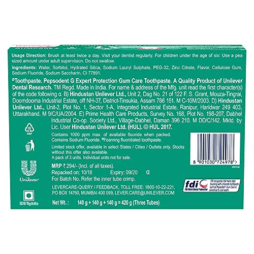 Reduce those dental visits with this expert protection gum care toothpaste from Pepsodent. Formulated zinc citrate technology, this toothpaste not only takes care of your teeth, but provides you with the best gum care. Its advanced formula consists of germ check and gum guard to provide you with 5 gum problems like bleeding gums, bad breath, tender gums, irritable gums and swollen gums. Its formula prevents your teeth from cavities, reduces tartar and lactic acid, and eliminates bacteria to give you a refreshing breath and healthier teeth and gums. Perfect for the whole family, this toothpaste should be used twice daily for effective results. Buy this value pack right away and get the complete oral care for your teeth and gums. A quality product of unilever dental research. TM Regd. Made in India. Brush at least twice a day. Visit your dentist regularly. Please avoid excessive sweet, sticky food. FDI world dental federation recognizes that twice daily brushing with fluoride toothpaste is beneficial to oral health. How to use: apply a peanut sized amount of toothpaste on a toothbrush and brush your teeth with it, rinse do not swallow. Use twice a day for best results or as directed by dentist. For children under the age of six: use pea sized amount under adult supervision. Do not swallow. Store in a cool, dry place.