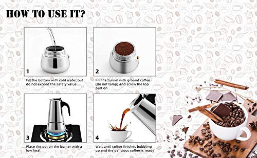 ☕【Stove and Induction Heat】: This stovetop espresso maker is suitable for fire, induction cookers, electric furnace, ceramic furnace, alcohol furnace and gas stove. The minimum coil diameter of the induction cooker must bigger than 8.5cm. (The bottom might turn black when it contacts with open flame, it does not affect use. It can be clean up with stainless steel cleaner if there black/scorch marks.)