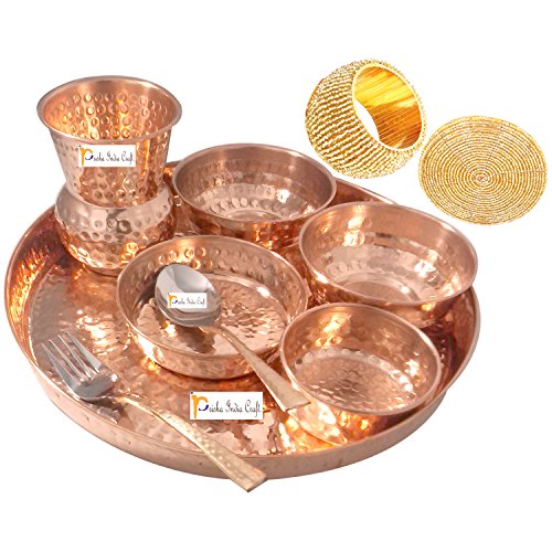 Prisha india craft copper utensils: dinnerware thali set of plate (thali set), bowls, tumbler, spoon.a thali set is a round platter with an eared rim. Entire meals can be served using this simple plate. The thali set is generally made with copper. Other dishes served on a thali set include vegetables, yogurt, chutney, and pickles. Care tips a) clean your copperware by hand and avoid dishwasher as the detergent can cause oxidation leading to permanent damage. B) use a solution of equal quantities vinegar or lemon juice and salt diluted with some water at such times but don’t use it regularly. C) avoid scratchy cleaners like steel wool. D) a simple, soft cleaning liquid on soap base, hot water and a soft washing cloth is best for daily use. E) use copper shining powder for cleaning the copper utensils. Completely safe and gentle on hands. F) copper utensils tarnish from time to time. This is normal for an authentic copper utensils. ; many customers love the vintage/antique tarnished look, but care instructions for minimizing and removing tarnish are provided with order