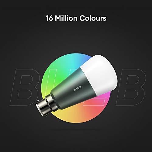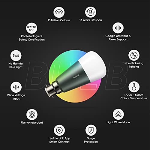 Specification: realme Smart WiFi LED 9W B22, Google Assistant and Alexa Support Bulb, 16 Million Colors, 13 Years of Lifespan (Grey)