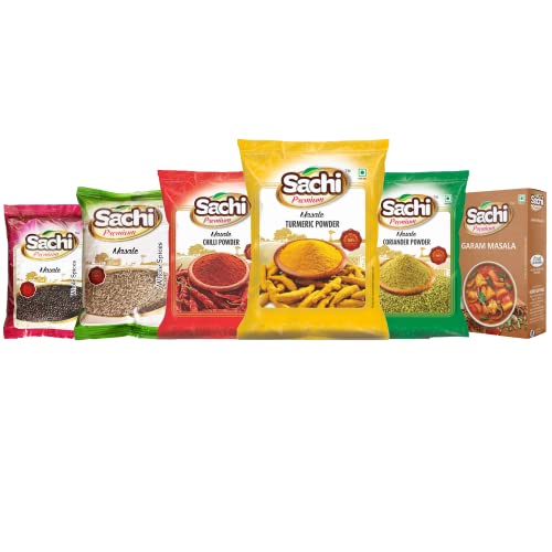 Specification: Sachi Premium masala combo Pack | Chilli(200 gms) | Turmeric(200 gms) | Coriander(200 gms) | Jeera Khada(100 gms) | Sarso khada(250 gms) | Garam Masala(50 gms)