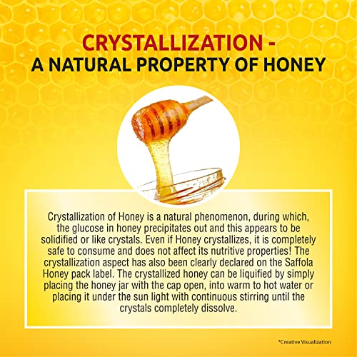 Saffola Honey is natural honey in its purest form. It is tested and approved after many rigorous quality checks including the NMR test. Each bottle of Saffola Pure Honey contains natural antioxidants, has No Added Sugar and comes with a Purity certificate that is made available to its consumers.