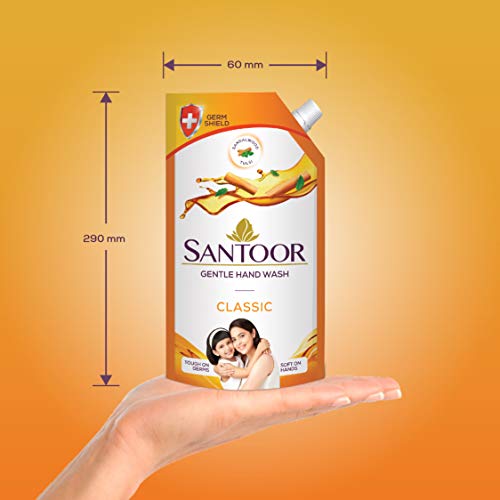 Santoor classic hand wash is enriched with the natural goodness of sandalwood and tulsi that offers unique dual benefit of tough on germs and soft on hands.