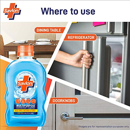 Savlon Multipurpose Disinfectant Cleaner Liquid kills virus & 99.9% germs including bacteria & fungi commonly found on multiple surfaces and also leaves behind a pleasant citrus fresh smell. A surface may look clean but that does not mean that it is germ free, this multipupose liquid cleans and disinfects surfaces to protect you and your loved ones from disease causing germs. This versatile liquid can be used on various surfaces such as kitchen slab, sink, dining table, door knobs, refrigerator, microwave, floor as well as for laundry hygiene. Basis lab study on sample microbes basis Active ingredient.